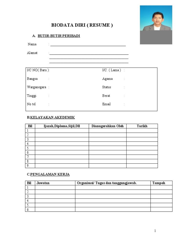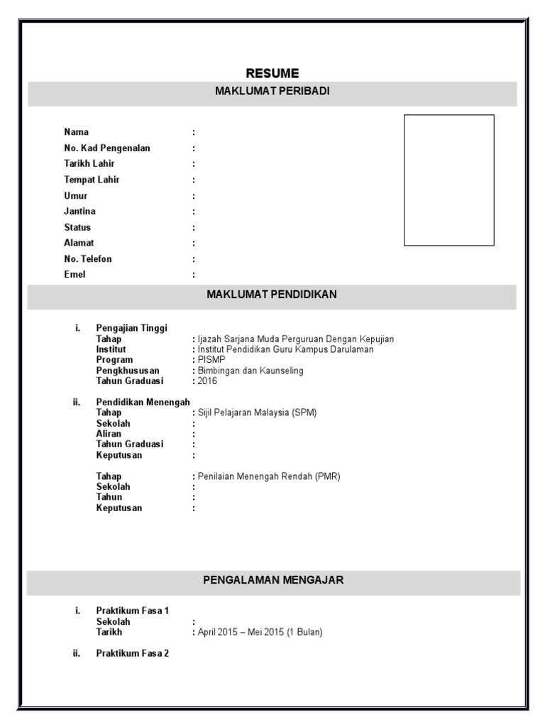 contoh borang resume kosong